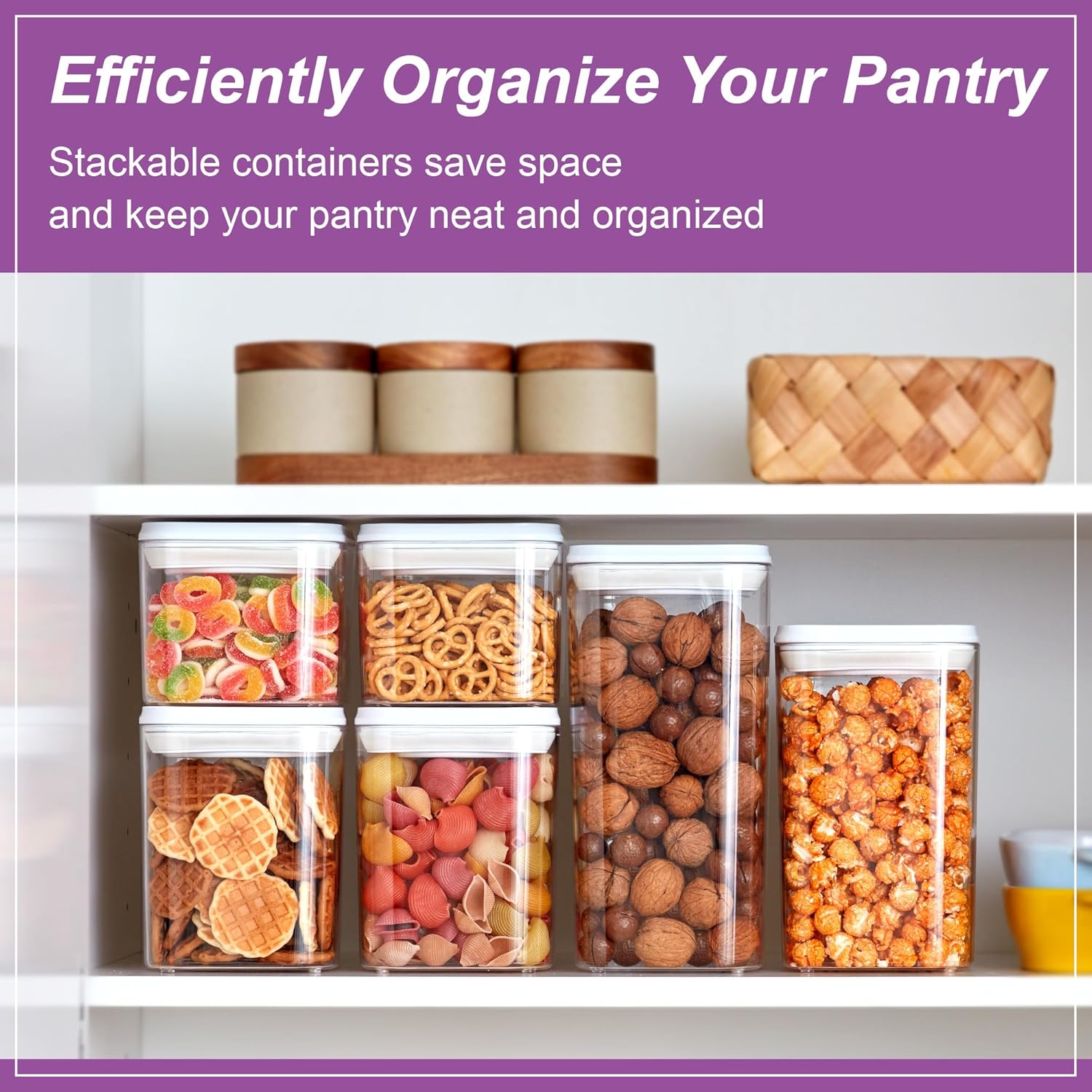FRESHNESS IN The silicone seal makes the canister airtight to keep in all the freshness, making it good storage for flour, sugar, cereal, pasta, coffee, tea, cookies, chips, nuts, snacks, and more. The stacking design makes it a super space saver for your kitchen and pantry shelf.