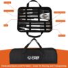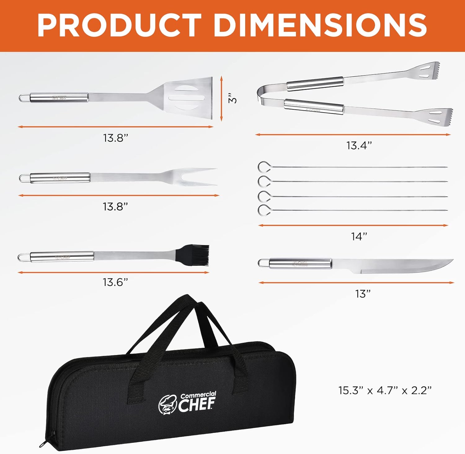 ALL IN ONE GRILL SET – Compatible with Weber, Char-Broil, Traeger, Dyno-Glo, NexGrill, Masterbuilt, Coleman, Kenmore grills, the set comes with Slotted Spatula, Tongs, Meat Fork, Knife, Basting Brush, 4X Steel Skewers, and Carry Bag