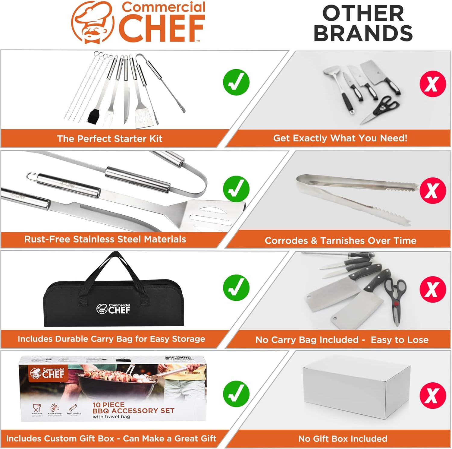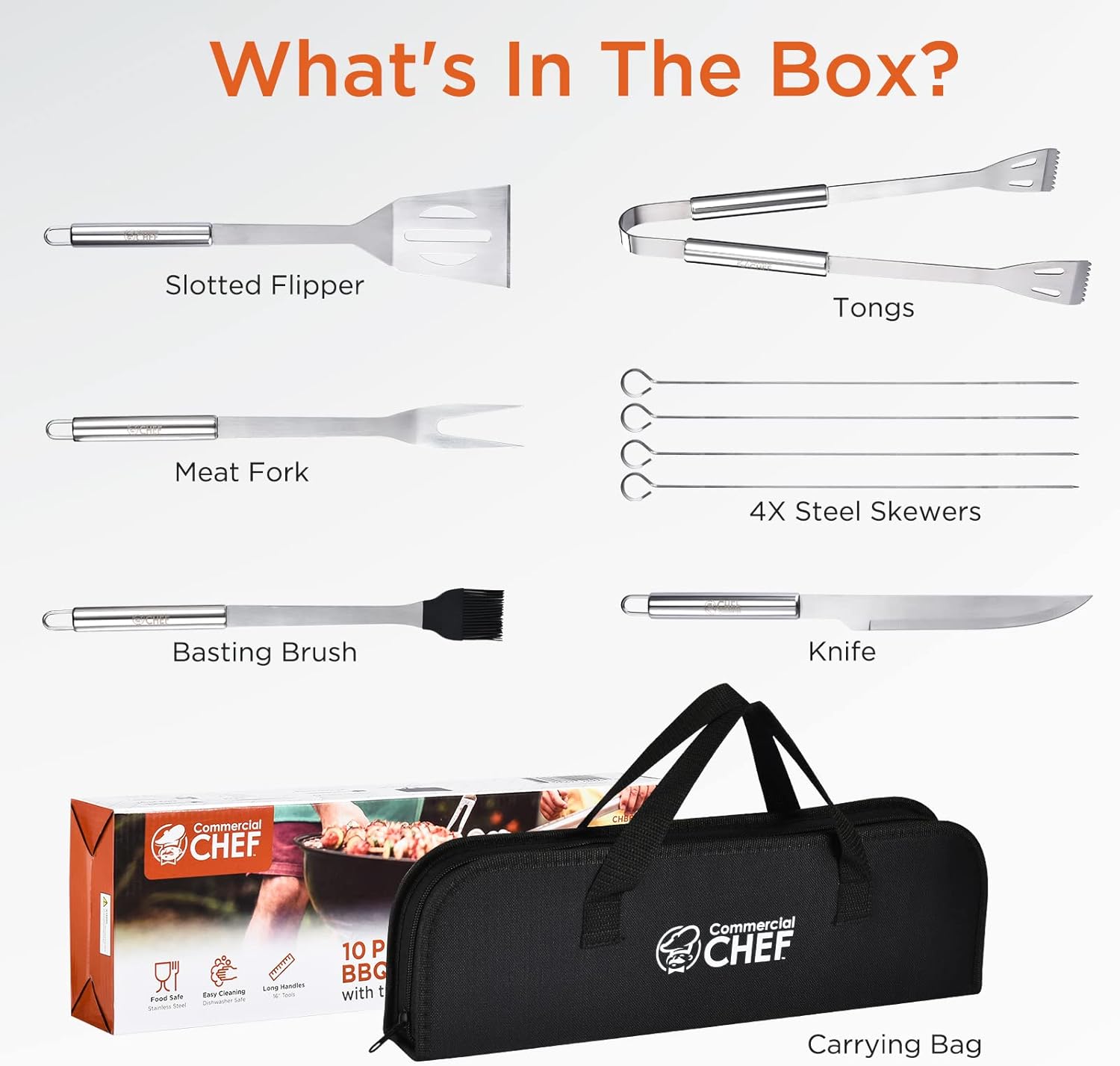 All of the 10 piece BBQ tools are made of stainless steel as it’s durable, rust resistant, and easy to clean, with elongated long handles with ergonomic, comfortable grips making it easy to maneuver food on the grill without being burned.