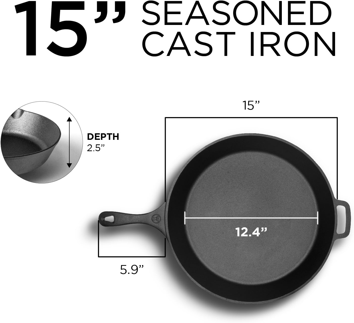 - VERSATILITY: This COMMERCIAL CHEF 15-inch cast iron skillet can be used on a stove top, in an oven, broiler or even outdoors at a campfire. Sear, bake or fry delicious meals with this cast iron skillet pan or even use as a serving dish from kitchen to table.