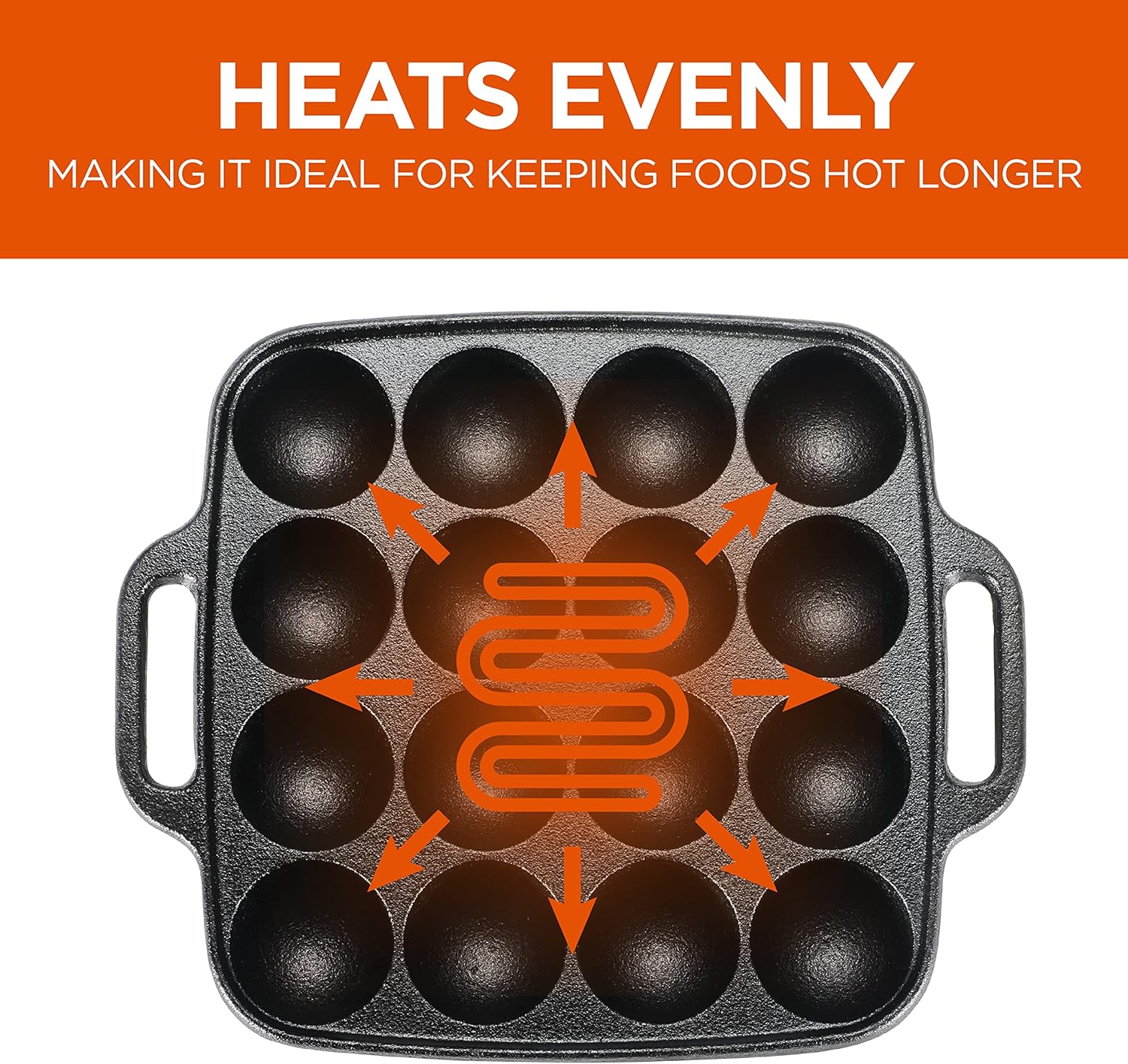 Cast Iron: This COMMERCIAL CHEF cast iron muffin top pan ensures you get the highest quality bake every single time. Create unique and memorable foods with this cast iron dutch oven aebleskiver pan.