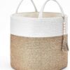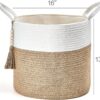 - Material: jute & cotton rope.The size is: 16″ W × 13.8″ L. Shipping folded could make the basket distort for a little, but the flaws in the bend will disappear over time. Using baskets or filling them will help speed up the process. Mkono is a registered trademark and our product is professional manufacturing and sole selling.