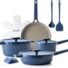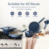 - Induction Compatible – The ceramic cookware set is made of heavy-duty cast aluminum that won’t warp. Its induction base is suitable for all stovetops. Heats up quickly and evenly.